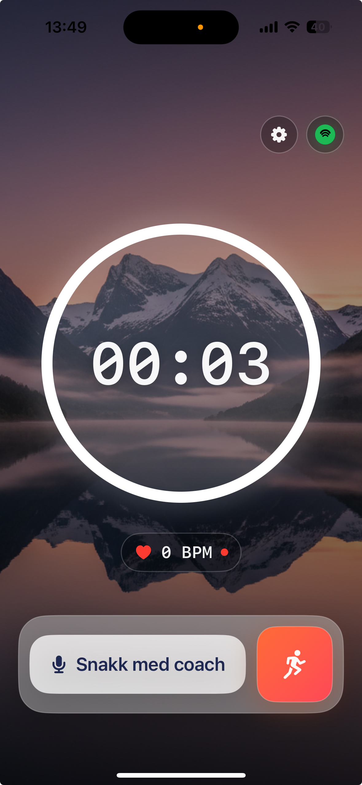 AI-coachen analyserer puls og pust i sanntid og gir deg korte, tydelige råd i øret. «Rolig nå», «Fint tempo», «Hold deg her»